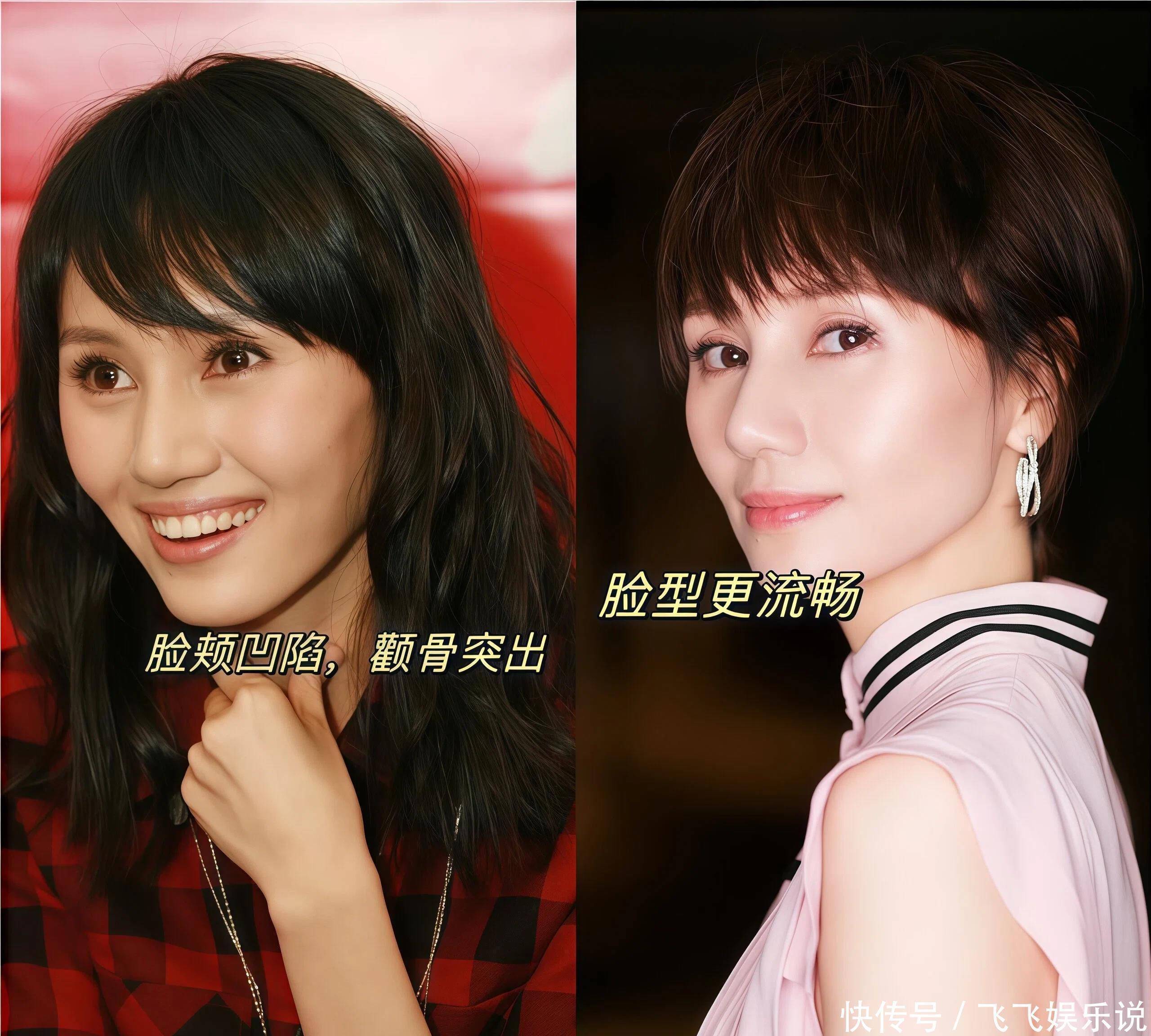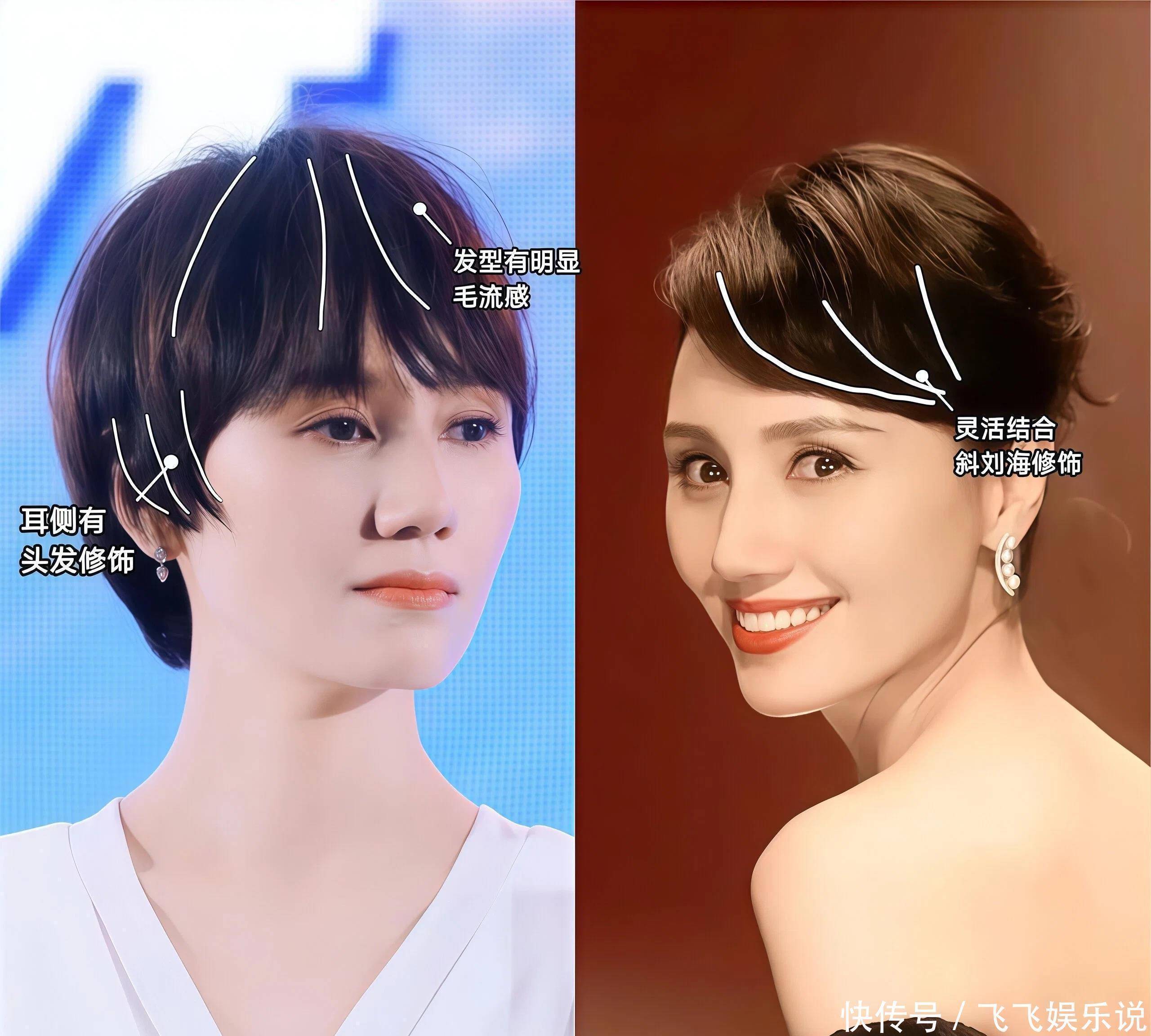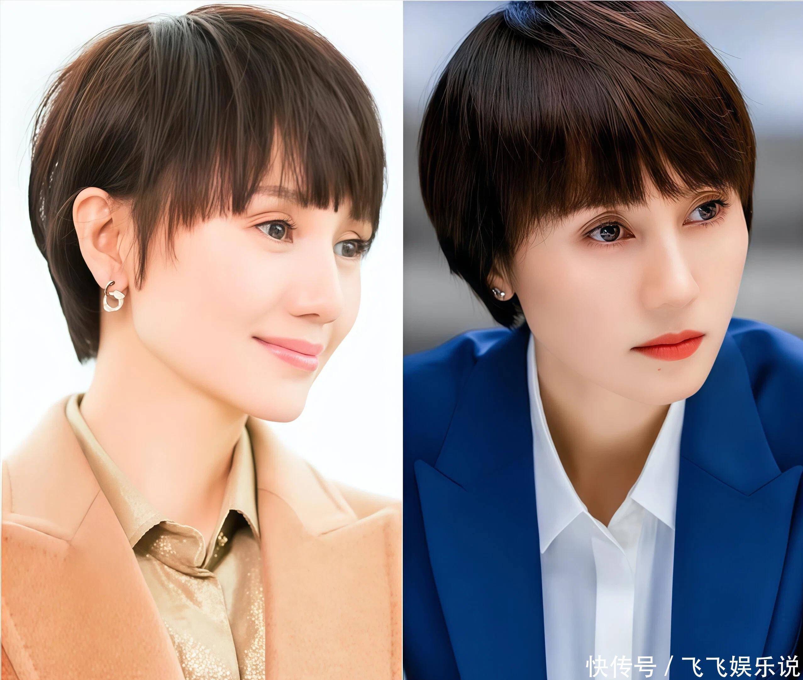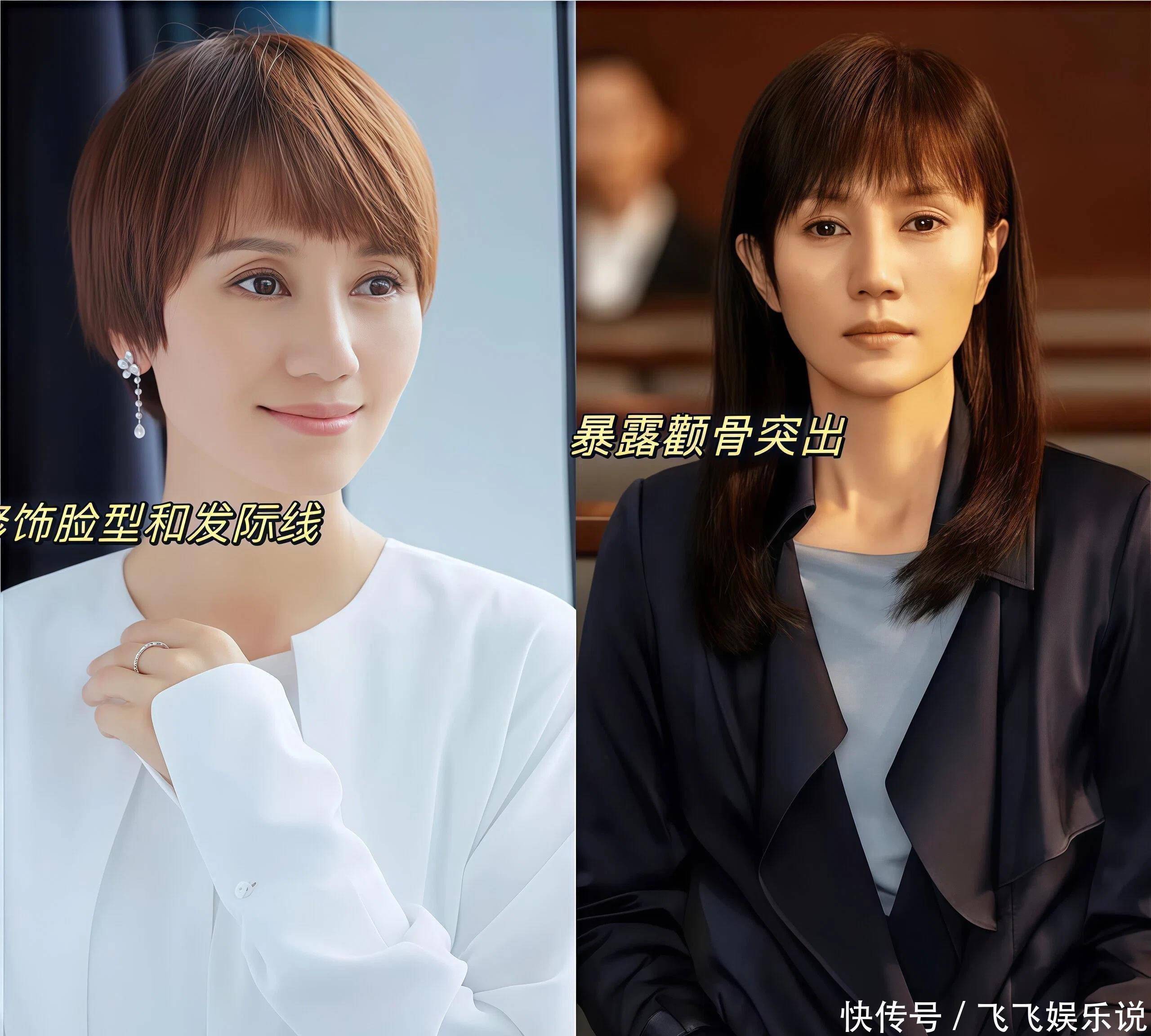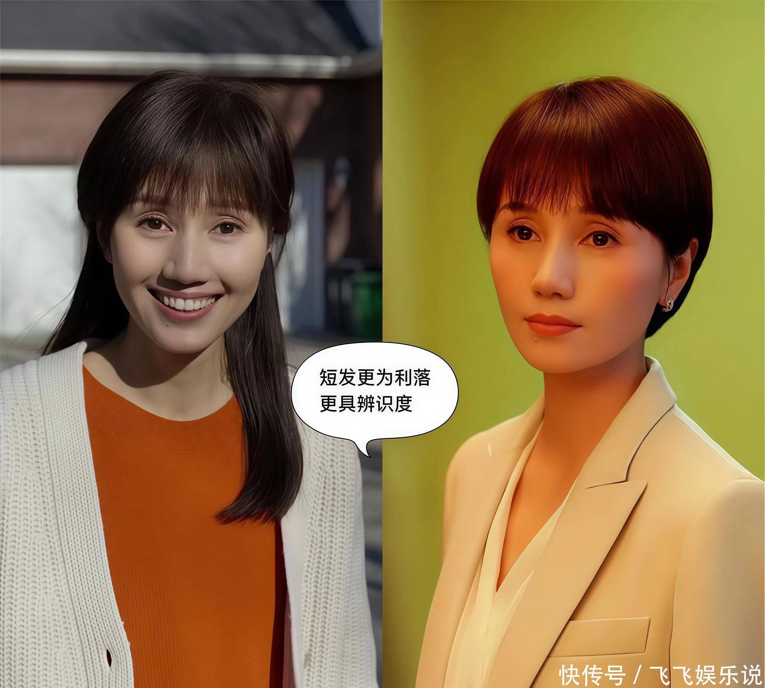 区别②短发修饰脸型VS长发暴露面部瑕疵真没想到,长发和短发差距竟然可以这么大!袁泉留着一头层次感,短发成功修饰了脸型,借助刘海修饰发际线,显得五官更加精致立体了,反观长发造型,同样有刘海,却更容易暴露颧骨突出的问题,略显凶相。